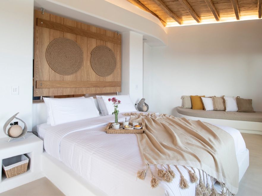 Perched on tranquil Kounoupas Hill, Villa Kissos is a rare find in Mykonos — combining timeless Cycladic architecture with lush landscaped gardens and panoramic views across the Aegean Sea. With eight en-suite bedrooms spread across a main house and three unique guest houses, the villa accommodates up to 18 guests in effortless style. Elegant interiors, a large ‘beach-style’ pool, multiple shaded dining areas, and even a private chapel make this estate ideal for families or friends gathering in complete privacy and comfort.