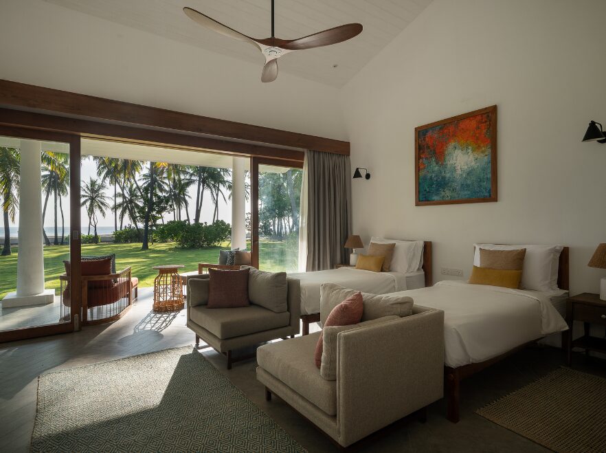 A stay at Kalkudah Beach House includes stylish accommodation in either the three-bedroom Main House or the two-bedroom Palm Villa, both of which can be booked separately or together for a fully private experience. Guests enjoy access to a large 22-metre outdoor swimming pool, beautifully landscaped gardens, and direct access to the pristine Kalkudah Beach. The property offers spacious living and dining areas, with full service from in-house chefs and staff, including daily housekeeping. Dining options include bed and breakfast, half board, or full board, with varied cuisine served in scenic locations around the estate.