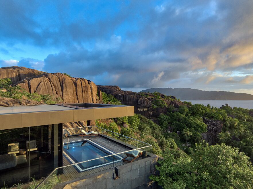 To reach Six Senses Zil Pasyon on Félicité Island, you can choose between a helicopter or boat transfer. The helicopter transfer offers a quick and luxurious 20-minute flight from Mahé International Airport, providing stunning aerial views of the Seychelles’ turquoise waters and lush islands. Alternatively, a boat transfer involves a 15-minute domestic flight from Mahé to Praslin Island, followed by a scenic 20-30 minute private boat ride to Félicité, combining the adventure of air and sea travel while offering picturesque vistas of the Indian Ocean.